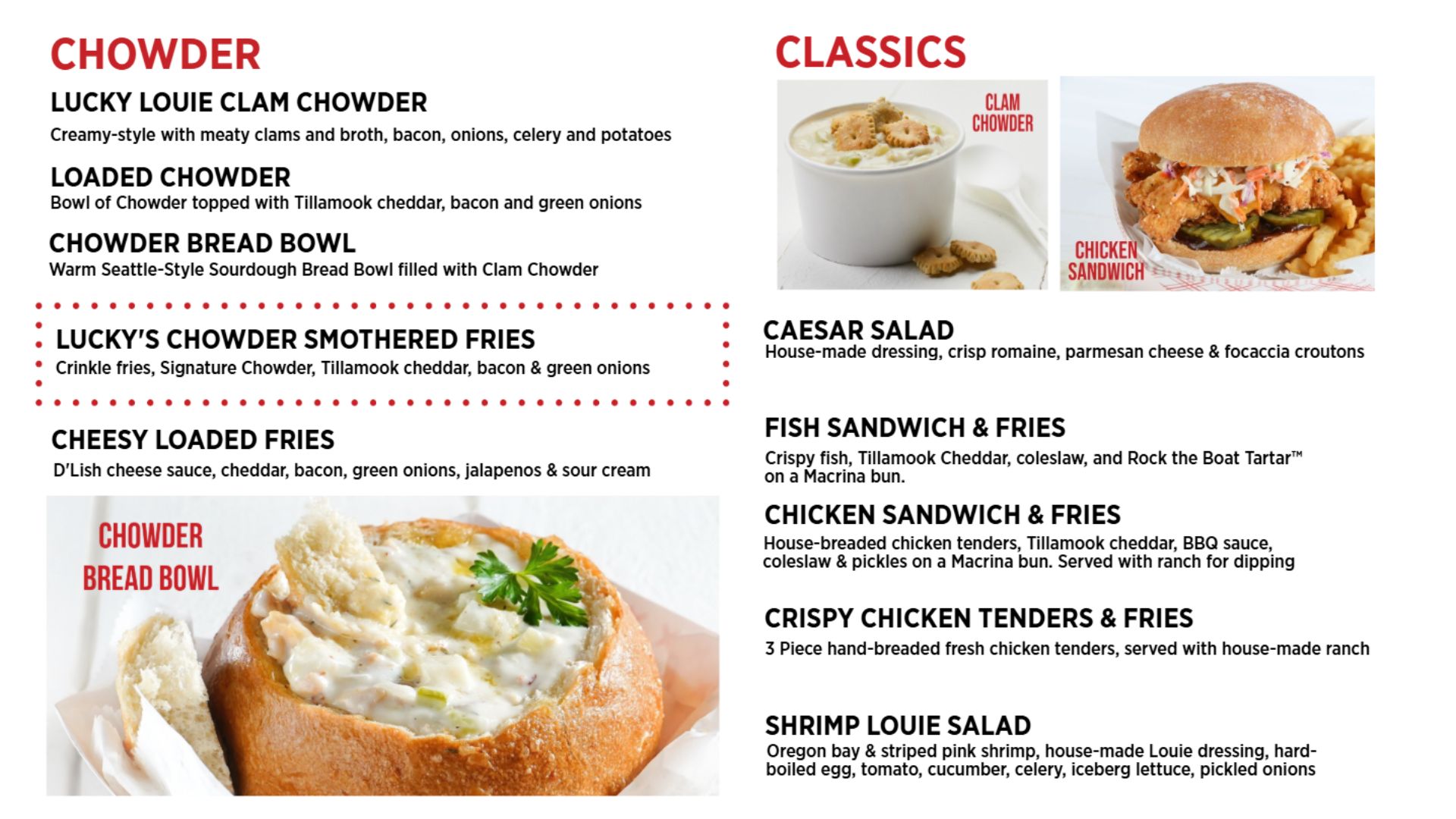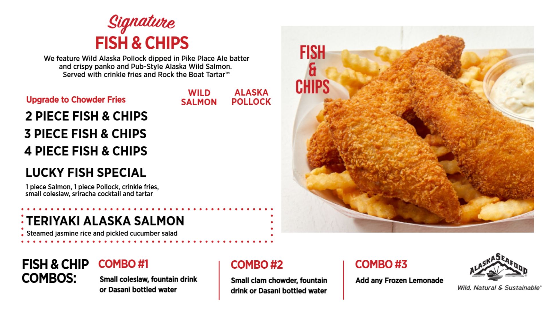 Lucky Louie Fish Shack is a Chef-driven Fast Casual Concept. We are proud to serve inspired NW seafood classics – Fish & Chips made with Alaska Wild and Sustainable Pollock and Salmon, Creamy Clam Chowder, Honey Teriyaki Salmon, and Classic Shrimp Louie Salads. And for an anytime treat, creamy cheesecake filled Sweet Waffle Fish – all served up fresh and fast!